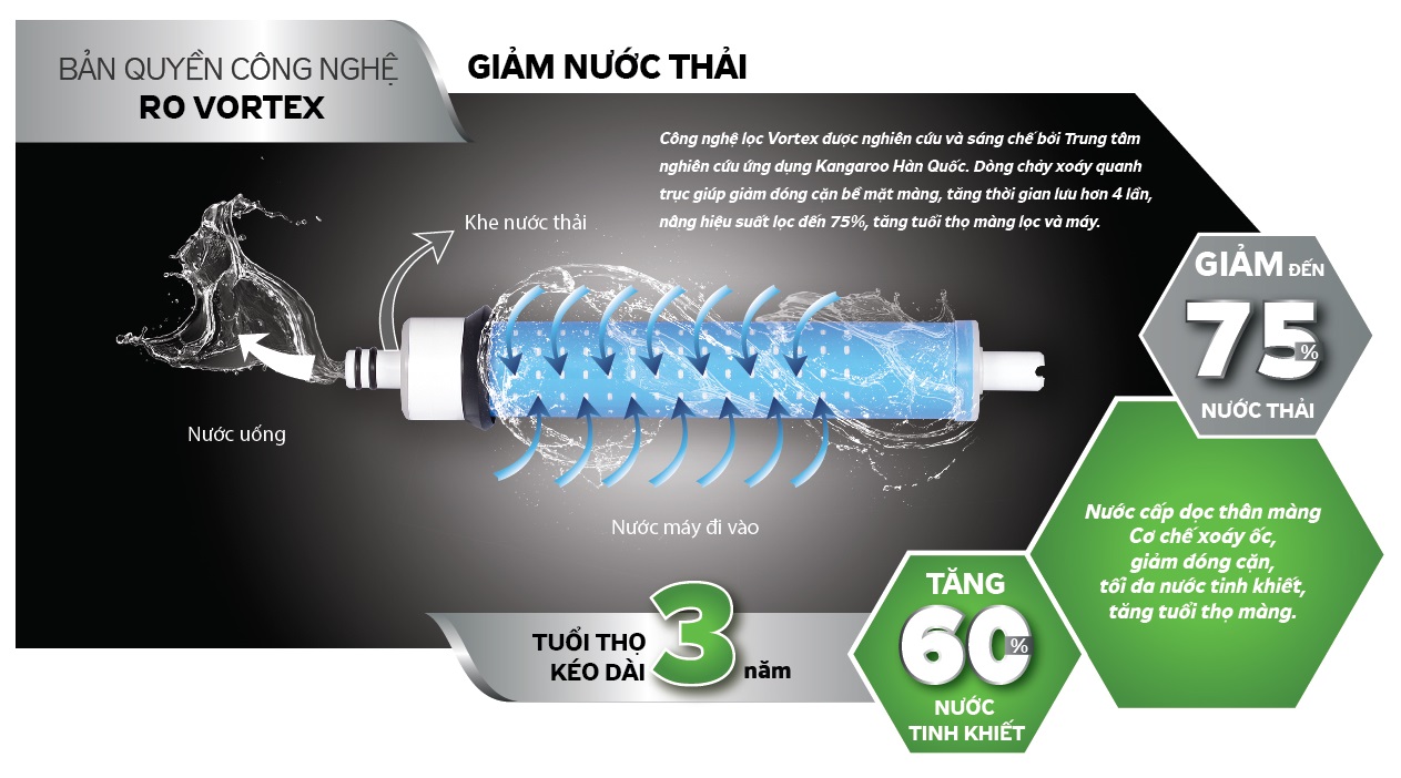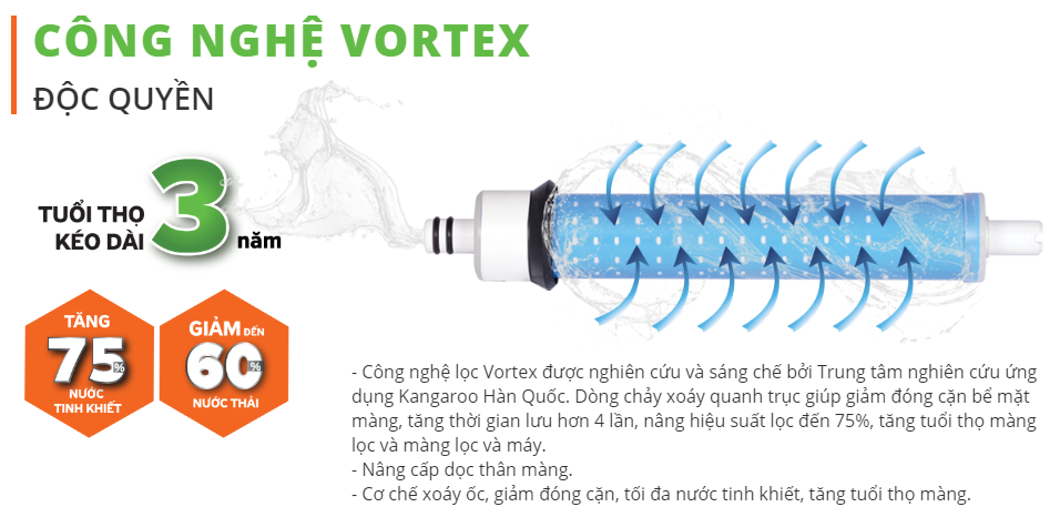 - Công nghệ lọc Vortex được nghiên cứu và sáng chế bởi trung tâm nghiên cứu ứng dụng Kangaroo Hàn Quốc. Dòng chảy xoáy quanh trục giảm đóng cặn bề mặt màng , tăng thời gian lưu hơn 4 lần , nâng hiệu suất lọc đến 75% , tăng tuổi thọ màng lọc và máy.