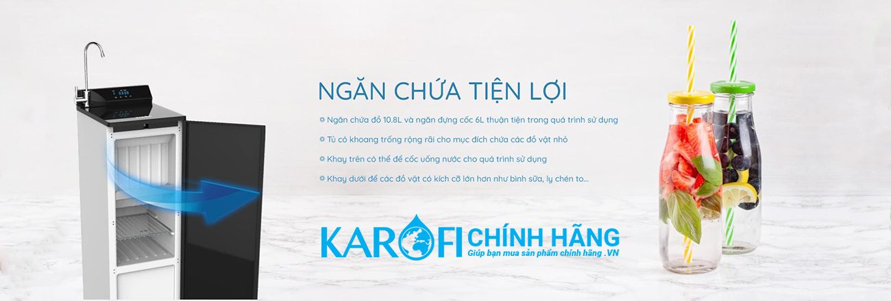 - Máy lọc nước Karofi Optimus Plus Với thiết kế nội thất tủ mới tiết kiệm diện tích với 2 khoang chứa : 1 khoang chứa đồ có điện tích 10.8 lít, khoang chứa cốc 6 lít giúp tăng trải nghiệm khi sử dụng, vừa dễ thay thế lõi, vừa có thêm không gian để chưa vật dụng như cốc, chén, trà, cafe...