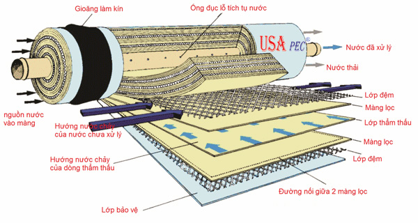 – Nguyên liệu: Màng lọc RO thẩm thấu ngược, có khe hở đạt 0,0001 micron